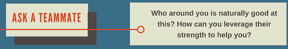 To leverage a teammate, ask yourself: Who around me is naturally good at this? How could I leverage their strength to help me accomplish my goals?